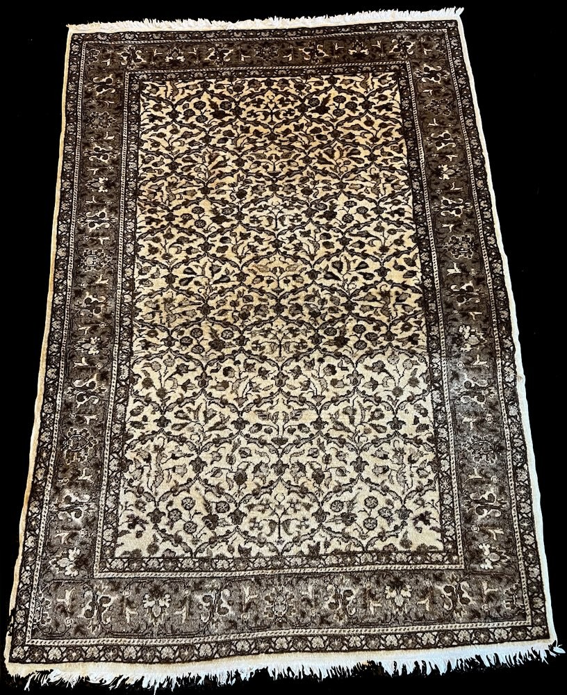 This is an elegant Kayseri carpet with an allover floral arabesque field in a dense repeat of stylized vine and palmette motifs on a warm ivory ground. The intricate cascade of small floral elements creates a subtle, lace‑like overall pattern framed by multiple guard borders and a wider main border containing alternating floral sprays in brown and taupe tones. The piece is a rrefined, city‑style Anatolian carpet with delicate floral design, muted neutral palette, and high knot density indicating skilled workshop craftsmanship.